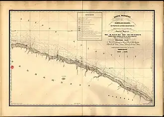 Vital de Oliveira's first survey was of the coast of Brazil between Pitimbu and São Bento in the sloop of war Parahybano. The chart from this survey was accompanied by a detailed description.[2] In 1858 he published a chart of das Rocas, a coral atoll in the South Atlantic.[1] In 1862 he published five charts covering the coast from Mossoró to the São Francisco River.[3] These charts were subsequently re-published in 1864 as United Kingdom Admiralty charts.[4]