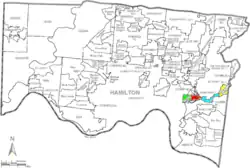 Mariemont City School District within Hamilton County includes Fairfax (green), Mariemont (red), a portion of Columbia Township (light blue) and Terrace Park (yellow).
