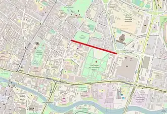 East–west street track extends Krasińskiego Street to the east. It ends while meeting Ossoliński avenue and Piotrowskiego Street at Ossolińskich roundabout.