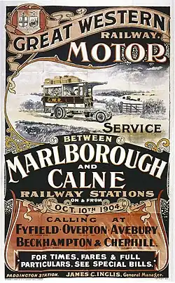 Marlborough GWR station became the focus for road traffic in the area, with horse buses at first along the Bath road; motor buses were introduced in 1904. Many of the bus services were operated by the GWR.[5]