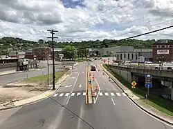 MD 51 continues south on the west side of the South End neighborhood of Cumberland as a four-lane divided highway. The state highway turns to a more eastward direction and gains a wide median with houses and businesses just before intersecting Virginia Avenue. Southbound Virginia Avenue completes the missing movements from the partial interchange with Canal Parkway, while northbound Virginia Avenue heads through the Chapel Hill Historic District. After the median narrows, MD 51 parallels CSX's Cumberland rail yard. MD 51's name changes to Oldtown Road after intersecting the old alignment with the same name that passes through the South End of Cumberland. Shortly after leaving the city limits of Cumberland, MD 51 crosses Evitts Creek and intersects Messick Road, which is unsigned MD 639, then turns south through the unincorporated community of Evitts Creek, continuing to parallel the rail yard. The state highway reduces to a two-lane undivided road after passing Uhl Highway, an old alignment of MD 51 that is unsigned MD 51E. The rail yard ends at Mexico Farms Road, which provides access to Mexico Farms Airport and the Warrior Run Generating Station. Within the hamlet of North Branch, MD 51 intersects as other end of Uhl Highway as well as Pittsburgh Plate Glass Road, which serves the North Branch Industrial Complex, including Federal Correctional Institution, Cumberland.[1][2]