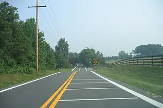 MD 97 crosses the Patuxent River into Howard County, where it becomes Roxbury Mills Road, named after the Roxbury Mill built in 1753.[1] It continues north, passing areas of woods and farms along with suburban residential developments.[2] The road heads through the community of Glenwood and continues through agricultural areas before intersecting MD 144 (Frederick Road) in the community of Cooksville. A park and ride lot is located at the northeast corner of this intersection.[1][2] A short distance later, the route has a diamond interchange with I-70/US 40. Past this interchange, MD 97 becomes Hoods Mill Road and passes rural residential areas, intersecting Old Frederick Road.[1][2] From here, the road winds through a mix of woods, farm fields, and residences before crossing the South Branch of the Patapsco River.[1][2]