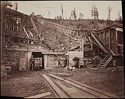 View of Marysville's mines, including the Maskelyne Tunnel (est. 1883) of the Drumlummon Mine. Photograph by Carleton E. Watkins (c. 1884–1890)