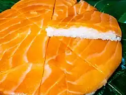 Masuzushi is made of vinegared trout sashimi on top of vinegared rice and wrapped in bamboo leaves. Once the fish and rice is wrapped in bamboo leaves, a weight (often a heavy stone) is kept on top for several hours in order to compress and complete the dish.[2][3] It is traditionally kept in a round bentwood box known as a mage-wappa, which is then sealed by two bamboo sticks.[4] There are also masuzushi which consist of two layers of fish and rice.[2]