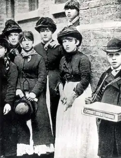 The workers were paid different rates for completing a ten-hour day, depending on the type of work undertaken.[24] The frame-fillers were paid 1 shilling (s) per 100 frames completed; the cutters received 234 d for three gross of boxes, and the packers got 1s 9d per 100 boxes wrapped up. Those under 14 years-of-age received a weekly wage of about 4 s.[25] Most workers were lucky if they took the full amounts home, as a series of fines were levied by the foremen, with the money deducted directly from wages. The fines included 3 d for having dirty feet—many of the workers were bare-footed as shoes were too expensive—or having an untidy workbench or talking; 5 d was deducted for being late; and a shilling for having a burnt match on the workbench. The women and girls involved in boxing up the matches had to pay the boys who brought them the frames from the drying ovens and had to supply their own glue and brushes. One girl who dropped a tray of matches was fined 6 d.[26][27]