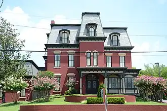 It is a 2+12-story brick building, with a mansard roof providing a full third story. The main facade is five bays wide, with a projecting central section topped by a mansarded tower. The roof is pierced by dormers with segmented-arch tops, and windows framed by decorative hoods. The main entrance is set in the base of the tower, with an elliptical stained glass light above. A porch shelters the entrance and wraps around to the right side, with a modillioned cornice and bracketed posts. Built in 1869, it is the last surviving post-Civil War mansion built along what became known as "Carpetbaggers' Row", as it is where a number of Northerners settled when moving to the city.[3]