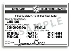 A sample of the Medicare card format used through 2018. The ID number is the subscriber's Social Security number, followed by a suffix indicating the holder's relationship to the subscriber (generally "A" for self).[30]