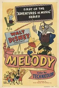 Melody is an American animated short film produced by Walt Disney Productions and directed by Ward Kimball and Charles A. Nichols. Originally released on May 28, 1953,[1] this film was the first in a proposed series of animated cartoon shorts teaching the principles of music, called Adventures in Music. Only one other entry in the series was produced, Toot, Whistle, Plunk and Boom, which was released later that same year, winning an Academy Award for Best Short Subject (Cartoons) the following year.