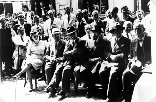 Benvenisti himself claimed to have embraced a "left-wing orientation [...] from back during the war."[157] This was influenced by his contacts with Mella Iancu, a Labor Zionist, and veered into support for a "people's democracy"; Benvenisti boasted his participation in collecting funds for the International Red Aid.[158] At a March 1945 speech in front of the Zionist group Dor Hadash, he noted that Zionism enjoyed support from the world's "most radically progressive circles", variously including the Communist Party USA and the Soviet trade unions; Zionism, he claimed at the time, would solve the "Jewish Question", leaving "fascist circles" to reveal themselves "for their true, unmasked, self: enemies of democracy, proving that we Jews were but their mere pretext."[159] In February 1946, Benvenisti criticized the Anglo-American Committee of Inquiry, arguing that Palestinian issues could only be solved with Soviet input.[160] He later explained that he viewed the Soviet government as Zionism and Israel's one true ally, since the "Jewish bourgeoisie was never fully committed to creating this state [of Israel]."[161] On May 11, 1946, he was a witness for the prosecution at Mihai Antonescu's trial by the People's Tribunal, where he spoke of deportations in Transnistria as amounting to an "extermination regime", concluding that over 270,000 Jews had been killed under the Antonescus.[115]