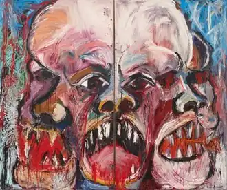 During his initial decades in San Francisco, Henderson created figurative paintings and films that engaged with themes of social protest, racial violence, and Black identity. His work from this period is noted for its directness and exploration of Afrofuturism and surrealism within the context of Black life and struggle influenced by the activist spirit of the Bay Area in the 1960s and 1970s.[6] Henderson's The Scream (1966), a monumental 10-foot x 12-foot painting depicting three disembodied and conjoined skull-like heads screaming with wide-open, blood-red mouths was born out of his own struggles with the racial injustice in San Francisco to,[7] in his own words, "release a scream that was inside of me".[5] A significant portion of Henderson's output from these first two decades was damaged in a studio fire in 1985.[8]