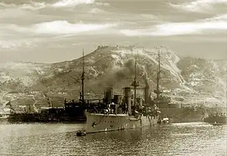 The Novik in warpaint, Eastern Basin of Port Arthur. 1904