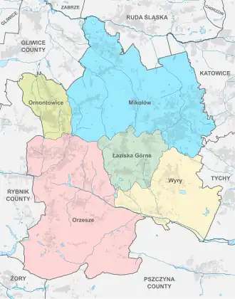 Mikołów County is bordered by the city of Ruda Śląska to the north, Katowice and Tychy to the east, Pszczyna County and Żory to the south, Rybnik County to the west and Gliwice County to the north-west.