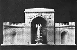 In 1924, Congress appropriated $1 million to construct Memorial Avenue and the Hemicycle.[9] The architectural firm of McKim, Mead & White won the competition to build Arlington Memorial Bridge as well as the new ceremonial entrance to Arlington National Cemetery. William Mitchell Kendall, an associate in the firm, designed the Hemicycle.[10] In May 1927, Kendall presented designs for the Hemicycle and "Avenue of Heroes" connecting the west terminus of the Arlington Memorial Bridge to the main gate of Arlington.[11] He proposed the following: