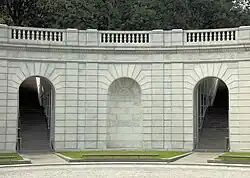 The Hemicycle is a Neoclassical[34] semicircle 30 feet (9.1 m) high and 226 feet (69 m) in diameter.[25][26] As planned, it served as a retaining wall for the hill behind it.[35] In the center is an apse 20 feet (6.1 m) across and 30 feet (9.1 m) high.[3][26] In total, the Hemicycle covers 4.2 acres (1.7 ha).[36] The walls ranged from 3 feet 6 inches (1.07 m) thick at the base to 2 feet 6 inches (0.76 m) at the top.[37] The accent panels and coffers in the apse were inlaid with red granite from Texas.[37] The Great Seal of the United States was carved in granite in the center of the apse arch, while on either side were seals of the United States Department of the Army (south) and the United States Department of the Navy (north).[25][38] Along the facade of the Hemicycle were 10 false doors or niches which were intended to house sculptures, memorial reliefs, and other artworks (which would act as memorials).[12] The outer, middle, and inner niche on each side was circular and 3 feet 6 inches (1.07 m) deep, while the other two niches between them were 2 feet (0.61 m) deep, rectangular, and had an oak leaf carved into the rear wall. All the niches were 9 feet (2.7 m) wide and 19 feet (5.8 m) high.[25][39] The apse originally held a fountain,[40] although by the 1990s it had not been used in many years.[39] A circle of unkempt grass filled the central plaza embraced by the Hemicycle's wings.[41]