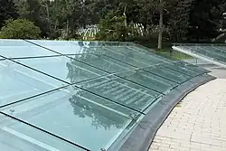 In March 1992, the Memorial announced it was ready to offer its design to the CFA, NCPC, and other approval agencies. The new design modified the Hemicycle by restoring a low water feature to the central niche and removing the grass circle, replacing it with a circular reflecting pool and paved plaza. The center of the plaza was slightly lowered, and very low terraces led from the edge of the pool to the edge of the plaza. Four niches were still pierced to create stairs leading up to the terrace, but now an elevator was added as well to make the memorial handicap-accessible. The tall illuminated pylons were removed, and in their place were 108 horizontal thick glass panels forming an arc in the back of the Hemicycle's terrace. These panels formed the skylight for the memorial below, and Weiss and Manfredi said they would contain quotations from women who served in the military. A thin stream of water was intended to flow over the panels, as if "carrying" women's voices to the water feature and reflecting pool.[93][94] Trees still framed the reflecting pool, but underground, behind the Hemicycle, the architects added a curved gallery and placed the rooms — the 250-seat auditorium, the computer room, the exhibition hall, the offices — in sequence.[49] The redesign won high praise from The Washington Post architecture critic Benjamin Forgey. He called it "a significant addition" to the city's memorials, and said it was "a perfect gesture in a proper place at a fitting moment". He also found the design sensitive, consistent, and poetic. The revisions, he said, had not harmed the memorial as they had so many other structures in the city. "...[S]omething definitely was gained. ... The second design is safer than the first, in some particulars more unified, and, in all respects save one, as evocative."[49]