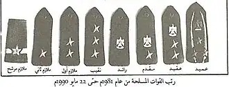 The Military ranks of South Yemen were the military insignia used by the People's Democratic Republic of Yemen[a] Armed Forces (officially known as the People's Defence Forces) until its dissolution during the 1990 Yemeni unification.