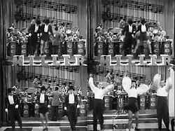 The Miller Brothers and Lois are known to have appeared in one film, Cab Calloway's Hi De Ho from 1947. The first section of their act in the film is prime class-act precision. The two men, in tailcoats and top hats, swivel around Lois, who wears the same getup except for a skirt and Cuban heels. She does what the boys do and throws in high kicks or walkovers as garnish. Across the buttes and valleys of five narrow platforms a few feet high that spell out M-I-L-L-E-R, Lois and one of the guys range sideways and backward, spreading a brisk and daring routine that would be impressive enough on the ground. The final section introduces loftier platforms, one a board almost tall enough to reach Lois's shoulders, and the tempo races even faster. The brothers break out their craziest wings, but the climax comes with Lois, elevated like a woman walking the plank, doing trenches and rotating like a stunt biplane.[1]
