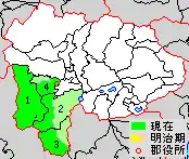 Map showing original extent of Minamikoma District in dark green, with areas added since 2000 in light green: