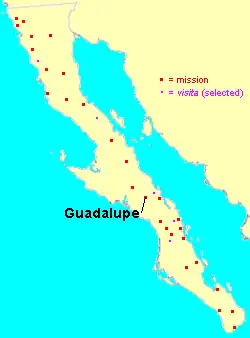 Mission Guadalupe was established by the Jesuit Everardo Helen in 1720, at the Cochimí settlement of Huasinapí in the Sierra de la Giganta about 40 kilometers west of Mulegé, Baja California Sur, Mexico. The mission was named after Our Lady of Guadalupe.
