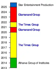 In 2015, the license was acquired by The Times Group, which organizes Femina Miss India. From 2015 to 2022, India's representatives for Miss Grand International were selected through the Femina Miss India competition.[3][4][5][6] In 2023, the franchise was transferred to the Glamanand Group, which launched Miss Grand India as a standalone pageant.[1][13][14]