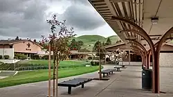 Mission San Jose High front entrance with the library building on the left and office on the right