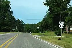 Mississippi Highway 496 (MS 496) is a 13.2-mile-long (21.24 km) east–west state highway in eastern Mississippi. The route starts at MS 19 near Meridian and travels eastwards through rural Lauderdale County. The road crosses the Alabama–Mississippi state line east of Alamucha, and it continues on as a county highway. The road that became part of the route was constructed in the 1920s, and it was designated as a state highway by 1957. Two projects in 1964 and 1974 resulted in the route being fully paved.