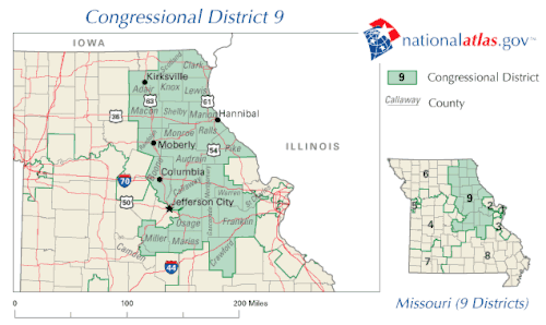 Missouri's 9th congressional district was a US congressional district, dissolved in 2013, that last encompassed rural Northeast Missouri, the area known as "Little Dixie," along with the larger towns of Columbia, Fulton, Kirksville and Union, Boone, Franklin, and a portion of St. Charles County comprise the highest voting centers of the mostly rural district. It was last represented by Republican Blaine Luetkemeyer.