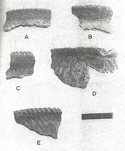 Further excavations were conducted in 2002 to further clarify questions about the subsistence patterns and site function.[21][22] Further examples of Moccasin Bluff Ware were recovered; Moccasin Bluff Plain Modified Lip, Moccasin Bluff Impressed Exterior Lip, Moccasin Bluff Scalloped, Moccasin Bluff Cordmarked, and Moccasin Bluff Plain.[22] In addition, there were vessels recovered from the Middle Woodland and also a partially reconstructed vessel from the Early Woodland, a poorly represented time period in the 1948 excavations.[22]
