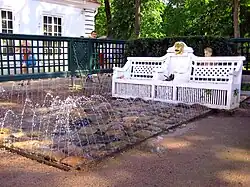 Side alleys of the garden have a number of prank fountains ("фонтаны-шутихи").[3] Two of them are disguised as benches, named «Диванчики» (Divanchiki, "Little sofas"). The fountain is activated when one steps on a pavement in front of such a "bench", and the person will be sprinkled.[4][5]