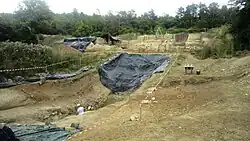 From 2002 onwards, new excavations on the summit plateau of the oppidum[15] led to the discovery of the remains of the Vix Palace, a very large building situated in a complex of buildings similar to a city, a new phenomenon at that time in the Celtic world.[16] These excavations, carried out each summer by archaeological teams from Germany (University of Kiel and Stuttgart), Austria (University of Vienna), France (University of Burgundy) and Switzerland (University of Zurich), coordinated by Bruno Chaume,[17] have revealed an imposing peripheral rampart surrounding the base of the mountain and opening up to the north towards the bed of the Seine, as well as a probable farm on the plain, close to the site of the discovery of the Vix crater and a sanctuary that had already been identified and excavated.[18]