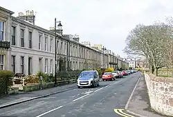 In the 1850s Baron Miller laid out Montgomerieston as a residential area. His feu plan, produced by Clarke and Bell[21] survives, however the square outline and circular central area layout was not followed.[31] Street names appropriate to the history of the barony and burgh have been applied,[2] such as Eglinton Terrace and Montgomerie Terrace for the first barons and later Cassillis Street and Ailsa Place for the Kennedy barons.[12][32] Cromwell himself is remembered at Cromwell Road.[32]