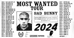 The Most Wanted Tour was the fifth concert tour by Puerto Rican rapper Bad Bunny to promote his fifth studio album Nadie Sabe Lo Que Va a Pasar Mañana (2023). Promoted by Live Nation and Rimas Entertainment, it began on February 21, 2024 in Salt Lake City and concluded on June 9 in San Juan, Puerto Rico, comprising 48 dates over 31 cities throughout North America.[1][2][3] All the shows were reported sold out and the tour grossed over US$211.4 million and sold over 753,000 tickets.[4] It was ranked 2nd on Billboard Top 10 Latin Tours of 2024.[5]