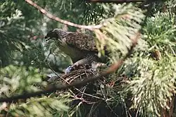 As is typical of accipitrids, the female takes by far the primary role in brooding and protecting the young, while the male makes prey deliveries into the nest or the nearby nest vicinity. Reportedly, the female is very aggressive if nest is disturbed but male is less so or not at all. The aggressiveness of the female may rival that of the often co-occurring spot-bellied eagle-owl and even outrival the defensive attacks on human by the more powerful African crowned eagle.[22][90] Cousins such as the Legge's and changeable hawk-eagle do not typically display any aggression or, if so, are very mild in protective behaviour towards humans while nesting.[12] Apparently, wood-cutters in particular often attract the ire of the female mountain hawk-eagle.[12] Unlike attacks on humans by crowned eagles and northern goshawks, the attack of mountain hawk-eagle is unlikely to be deterred either by traveling in parties or counterattack. Even when struck with branches, machetes or fist and hit with buckshot by humans, apparently the female will still not cease her attack unless killed or grievously injured.[12][91][92][93] In one case, a local woman in the Kumaon division of northern India fell victim to a "particularly savage" attack by a female mountain hawk-eagle and subsequently died from the injuries sustained.[12] Cases have been observed in north India where rhesus macaques, northern plains gray langurs (Semnopithecus entellus) and yellow-throated martens, all known nest predators, have been driven off by the female hawk-eagle, in the case of the marten while repeatedly raking the back as it ran off.[12] The males may make up to two prey deliveries each day but in the area of nests around disturbed village-side forest in India seemed to have problems procuring a sufficient amount of prey. Caches of food may be kept during incubation and the early nestling stage but generally cease thereafter.[12] After about three weeks, the young are more active and may engage in wing stretching and flapping. At this point, the female takes to a perch about 50 to 100 m (160 to 330 ft) away but continues to watchfully protect the young. The young may soon also be able to feed themselves but are often apparently fed by the mother well after this.[12] Reportedly family remains together for some time after young fly and the young eagle is fed until they can fly more strongly.[6] In Japan, an eaglet that hatched in April flew by the end of June.[94] In India, the minimum amount of time from hatching to leaving the nest was claimed as 53 days.[12] The breeding cycle lasts for at least 80 days.[6]