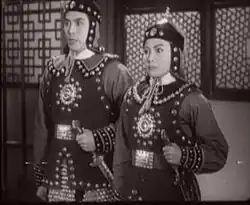 Among the many ways in which Chinese dramatists sought to galvanize the support of the people to fight against the invading Japanese, perhaps none was more effective and appealing than the cultivation and exaltation of female resistance symbols.[40] In the film, instead of the conventional representation of women, Bu Wancang portrays Mulan as a courageous warrior who is more masculine than any of her comrades as masculinity is defined by courage, loyalty and fearlessness in battle.[3][2] In a country's time of need, it is only Hua Mulan who does what is right and saves them all. Her behavior throughout the film is seen as exceptional as she stands out and outperforms the rest of the actual men.[3] This was already seen in the opening hunting scene where Mulan strikes a male hunter with her arrow and tells him she mistook him for a rabbit. This scene presented Mulan's masculinity over the other male hunters who have hunted down no animals in contrast to Mulan who has quite a haul as well as the emasculation of the male hunter she struck by comparing him to a rabbit which is slang for a homosexual man. This also demonstrated her superior skills as well as wisdom and brains as she manages to escape their humiliation in the end.[1] Her representation in the film is a symbol of what every man should strive to be as she is their role model. She has proved her potential and ability to accomplish great things with the right motives to the men. This leads to Mulan ultimately not being a role model for women but really a role model for men.[3]