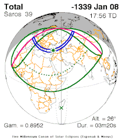 In contrast, the 1308 BC eclipse was annular, and began very early in the morning over Arabia (and only penumbral over Anatolia and Syria), reaching its height over Central Asia: