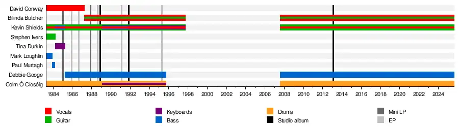 My Bloody Valentine are an Irish-English rock band[6][7][8][9][10][11] formed in Dublin in 1983 and consisting of founding members Kevin Shields (vocals, guitar, sampler) and Colm Ó Cíosóig (drums, sampler), with Bilinda Butcher (vocals, guitar) and Debbie Googe (bass). Their work is characterized by distorted guitar textures, subdued androgynous vocals, and unorthodox production techniques. They are widely cited as a pioneering act in the shoegaze genre.