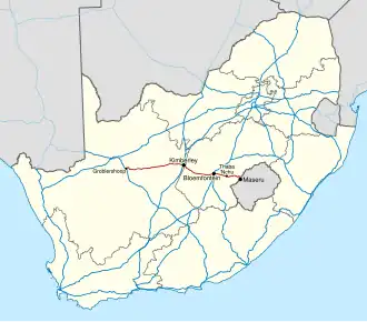 The N8 is a national route in South Africa that connects Groblershoop (south-east of Upington) with Maseru in Lesotho via Kimberley and Bloemfontein.[1] It is maintained by the South African National Roads Agency.