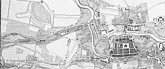 An 1857 map of Bydgoszcz shows the path beginning at the intersection with Holy Trinity Street (then Berliner Strasse) next to the bridge over the canal,[5] then entering the western suburban city of Prinzenthal. In 1872, a railway viaduct was built over the street for the line to Inowrocław (in 1897, the line extended to Żnin and, in 1908, to Poznań). After Bydgoszcz returning to Polish territory in 1920, suburban area, including Prinzenthal (today's Wilczak and Miedzyń) have been incorporated into the city administrative limits, making Nakielska street almost entirely part of Bydgoszcz. The final part was "acquired" during city border changes in 1954.[6]