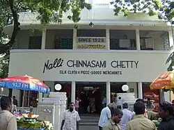 Nalli was established in T. Nagar in 1928 by Nalli Chinnasamy Chetti, a weaver who belonged to the Padmasali community.[1] Chinnasamy Chetti was a famous weaver of Kanchipuram sarees who had been weaving silk sarees since 1900 and gifted a Kanchipuram saree, the Durbar Pet, as a souvenir to George V during his visit to India in 1911. In 1928, he moved to the then Madras and became one of the first to open a shop in the neighbourhood of T. Nagar which was founded in the early 1920s.[2] The shop initially functioned from a house until Nalli established his own showroom in 1935.[2] Nalli Chinnasamy Chetti died in 1958 and was succeeded by his grandson Nalli Kuppusamy Chetti.[3][4]