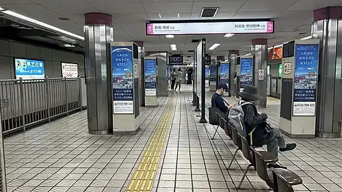 The Midōsuji Line station originally opened as an island platform serving two tracks, but overcrowding prompted construction of a side platform serving northbound trains (that platform opened in 1987). As of 2015, the island platform serves only southbound trains, and the northbound side of the island platform is fenced off.