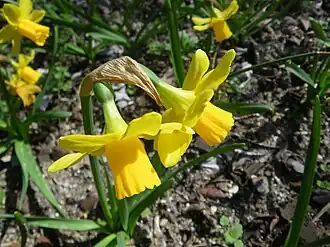Narcissus 'Tête-à-tête' is a hybrid cultivar of Narcissus, which was introduced in 1949.[1] It is one of 110 cultivars produced by British daffodil breeder Alec Gray.[2] 'Tête-à-tête' is a popular ornamental plant, which is known for its very early flowering period and short stature.[3] This cultivar is commonly used as a garden plant where it can be planted in pots,[4] rock gardens, garden borders[5] and even naturalized in lawns.[6] The cultivar name 'Tête-à-tête' means to have a conversation between two people,[7] which relates to the cultivar often hosting a pair of flowers per stem.[8]