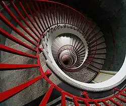 The entrance on the ground floor leads to a lobby lined with Karst marble. Upper storeys are accessible by elevator or the spiral stairway at the centre of the building.[13] Two of the elevators are fast and lead visitors to the café on the upper floors, while the third is slower and leads to the residential levels.[1] The stairway terminates at the tenth floor.