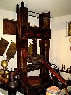 Much agricultural equipment is on display, including an old sessile oak vertical press, a thousand-year old oak wine press with horizontal structure and operation, the prototype of a tractor with a combustion engine, a collection of ancient nail ploughs and ploughshares, a sowing machine and hay baler. The wainwright's workshop (making the Sicilian cart) has been rebuilt.