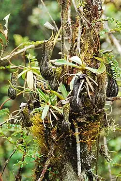 The typical habitat of this species is summit scrub vegetation as well as lower and upper montane mossy forest.[6][7] It always grows terrestrially, often in open sites such as ridge tops and cliff sides, where it is exposed to direct sunlight.[6] The species is rare in blangs, where the lack of surrounding vegetation means the stems scramble along the ground.[6] Nepenthes mikei may be difficult to find on Mount Pangulubao,[14] where it is sympatric with N. gymnamphora (N. xiphioides), N. ovata, and N. spectabilis.[2] On Mount Bandahara, where it is common above 2400 m,[6] it grows alongside N. diatas.[15] Natural hybrids with all of these species have been recorded.[6] At another location, which is undisclosed for conservation purposes, N. mikei grows alongside N. flava.[16]