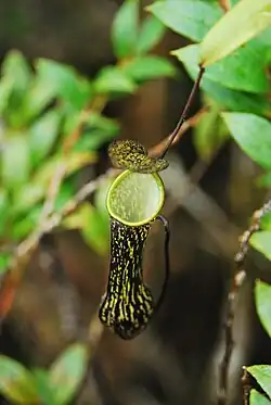Rosette and lower pitchers are ovate in the basal third to quarter of the pitcher cup, becoming approximately cylindrical above and infundibular towards the pitcher mouth. They are relatively small, growing to only 12 cm in height by 3 cm in width. A pair of wings (≤4 mm wide) typically runs down the ventral surface of the pitcher cup, with fringe elements measuring up to 8 mm in length. These wings may be reduced to ribs in some plants. The glandular region on the inner surface is restricted to the ovate portion of the pitcher cup.[6] The glands are small (0.2–0.3 mm in diameter) and occur at a density of around 150–180 per square centimetre.[2] The waxy zone is well developed[12] and eye spots may occasionally be present on the rear inner surface, visible through the opening.[7] The peristome is sub-cylindrical[6] to cylindrical and up to 4 mm wide. It bears ribs up to 0.1 mm high and spaced 0.2 mm apart, which terminate in teeth up to 0.4 mm long.[7] The inner portion of the peristome accounts for around 51% of its total cross-sectional surface length.[12] The pitcher lid or operculum is ovate and has a cordate base. It measures up to 3 cm in length by 2.5 cm in width and does not bear any appendages. The underside of the lid has an even distribution of small (0.1–0.2 mm in diameter) convex glands, occurring at a density of about 40/cm2.[2] The spur, which is inserted near the base of the lid, is up to 7 mm long and may be simple, forked, or fasciculate[7] with up to 12 branches.[2]