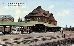 The New Haven and New London Railroad merged with the New London and Stonington in 1857 to form the New Haven, New London and Stonington Railroad. The line was leased by the New York, Providence and Boston Railroad (NYP&B) in 1859. The NYP&B bought the section east of Groton outright in 1864; the section from New London westward was spun off as the Shore Line Railway. In 1870, the Shore Line was leased by the New York and New Haven Railroad, which itself became part of the New York, New Haven and Hartford Railroad in 1872.[11] At some point during this series of events, the 1852-built station was replaced by a larger, two-story structure, which was also used by some through trains from the north.[10]