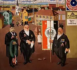 The verists' vehement form of realism emphasized the ugly and sordid.[7] Their art was raw, provocative, and harshly satirical. George Grosz and Otto Dix are considered the most important of the verists.[8] The verists developed Dada's abandonment of any pictorial rules or artistic language into a “satirical hyperrealism”, as termed by Raoul Hausmann, and of which the best known examples are the graphical works and photo-montages of John Heartfield. Use of collage in these works became a compositional principle to blend reality and art, as if to suggest that to record the facts of reality was to go beyond the most simple appearances of things.[3] Artists such as Grosz, Dix, Georg Scholz, and Rudolf Schlichter painted satirical scenes that often depicted a madness behind what was happening, depicting the participants as cartoon-like. When painting portraits, they gave emphasis to particular features or objects that were seen as distinctive aspects of the person depicted.