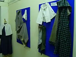 The girls wore long green and blue plaid cloaks in cold weather, and a shepherd's plaid shawl in warm weather. Their summer walking out dresses were dull lilac cotton with a small cape or tippet. A straw bonnet was worn all year, to which was attached a green and white check ribbon for tying the bonnet on. Everyday wear was provided for by navy cotton dresses with white polka dots. Girls up to the age of 14 wore blue-checked gingham pinafores indoors, after this they added aprons and were promoted to "House Girls". As part of their domestic training, the girls made their own clothes.