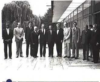 Giosan (4th from left) helps welcome US Congressman John Brademas (5th left) to Romania, together with Nicolae Ceaușescu (6th left), August 1979