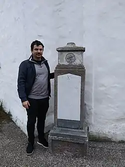 Sandstone grave monument for Niels and Karen Lassen, approx. 1810, by the choir at Sædder church. Descendant Kevin B. Højgaard-Christiansen stands next to it.